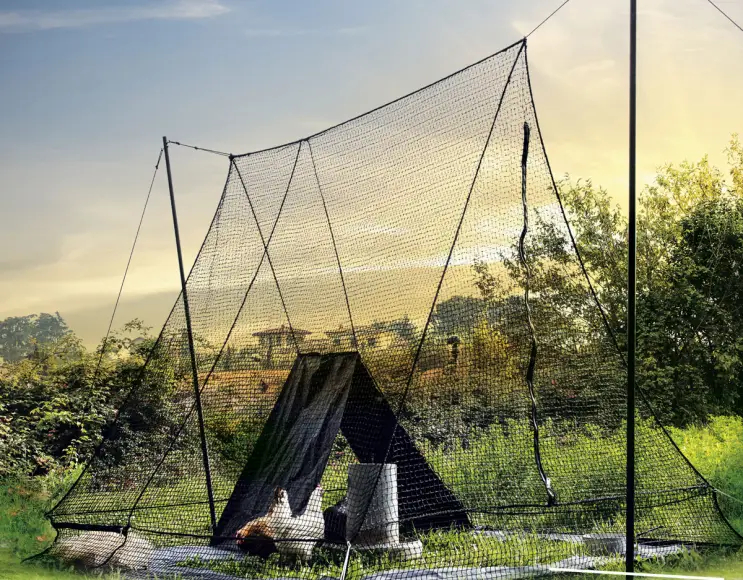 Hühnerstall aus Netz für Geflügelhaltung, aus unverwüstbarem Polyethylengewebe mit Maschenweite 25 mm und 2,5 mm hochfester Leine, UV-behandelt, für den Außeneinsatz. Schwarz. Verarbeitung in Form einer Hütte mit den Maßen 2,50X2,50X2,50 Meter, eingefasst entlang des gesamten Umfangs mit Spannseil im oberen Teil. Ausgestattet mit einer Reißverschlussöffnung, die den Einstieg des Bedieners ermöglicht, und einem seitlichen Reißverschluss zum Sammeln der Eiern von außen. Im Inneren befindet sich eine Abdeckung aus hochfestem PVC-Gewebe, um die Tiere zu schützen. Ausgestattet mit einem hochfesten PVC-Band auf dem Boden, um die Mast anderer Tiere zu verhindern und zur Stabilisierung der Struktur. Im Lieferumfang enthalten ist der Satz mit 6 Heringen und 12 elastischen Seilen zur Verankerung am Boden.